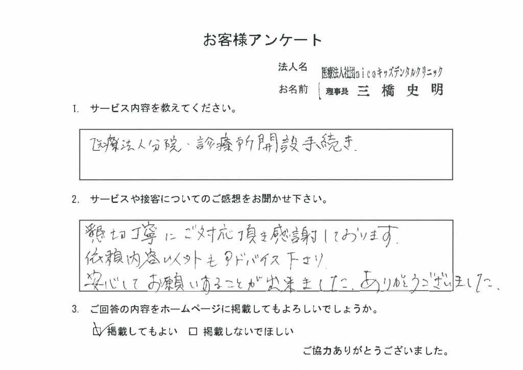 医療法人やNPO法人の設立、障害福祉サービス事業所の開設手続きなどの各種許認可手続きおよび運営支援に対応するとともに、消防計画書の作成や補助金申請を含め、事業の立ち上げから運営まで一貫して支援しております。